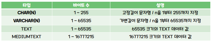 - CHAR(N), VARCHAR(N) : 간단한 이름정도 : N에는 바이트 제한을 줄 수있는 숫자가 들어간다.