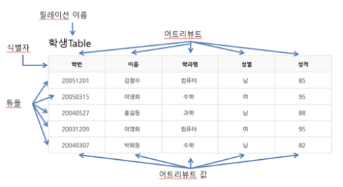 - 관계형 데이터베이스 : R(Relational)DBMS : DBMS에 관계가 추가된 것