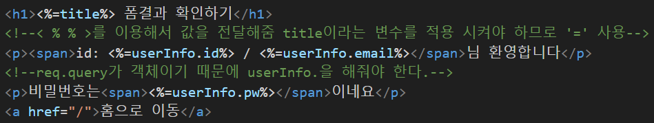 id 와 email, pw는 query에 담겨있기 때문에 userInfo로 담아주고 result 파일에서 userInfo.(정보)로 적용 시켜준다.