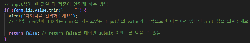 form에 name값을 적어도 되고 form에 id값을 적어도 같은 form을 불러 올 수 있다.만약 form안에 id2라는 name을 가진 input창의 value값이 공백으로만 이루어져 있다면 다음 함수를 실행 해 주세요라는 코드이다.