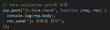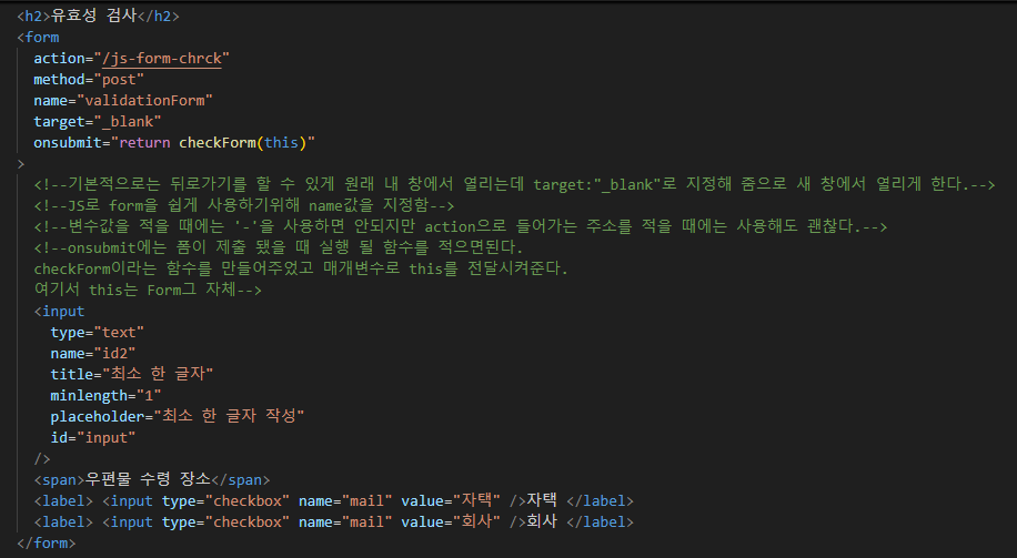 checkbox는 기본 default 값으로 checked 옵션이 false가 되어있어서 체크가 안되어있다.배열의 형태로 값이 나타나진다.return에 false를 해야만 submit 이벤트를 막을 수 있다.form validation을 post로 요청해 주는 API 작성