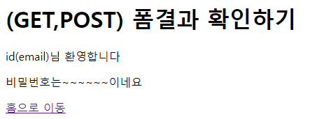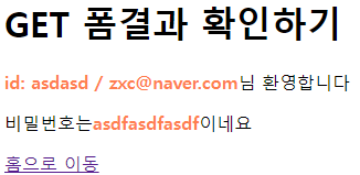 사용된 정보(title: GET, query에 담겨있고, 사용자가 입력하는 id, email, pw) 들로 이뤄진 result 화면을 볼 수 있다.