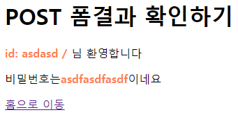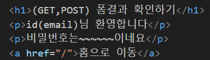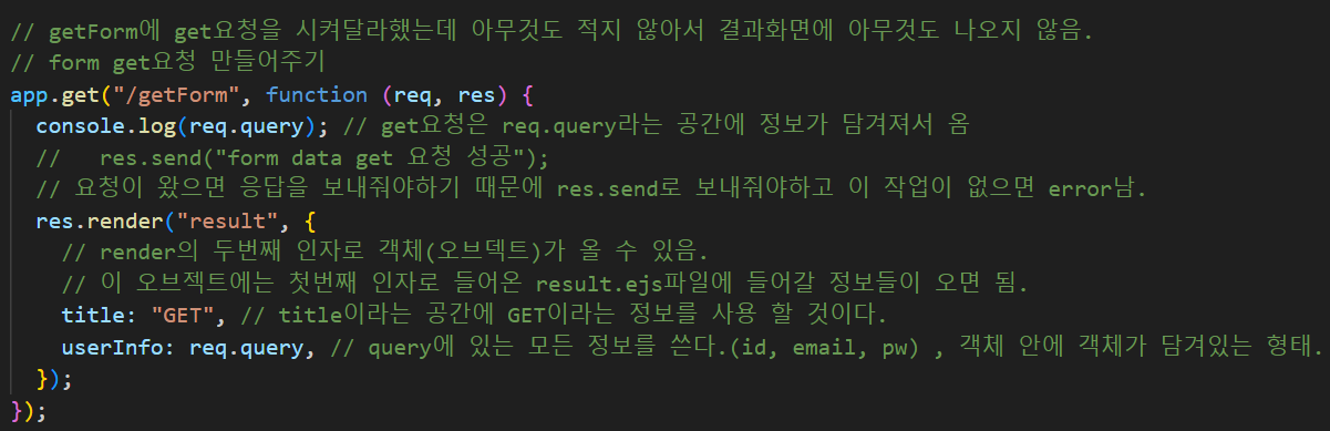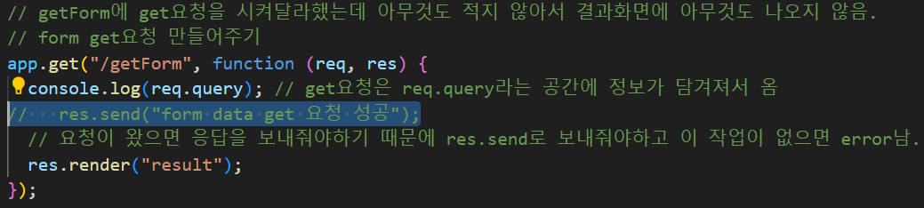 그래서 그냥 텍스트만 전달 했던 send 부분은 주석처리를 하고 render를 이용해서 result파일을 연결 해주었다.get 요청으로 전송된 결과 화면에서는