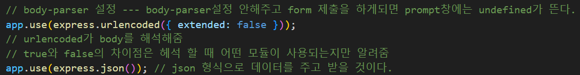 body-parser은 body를 해석해주는 설정으로 urlencoded에서 해석을 진행해준다.