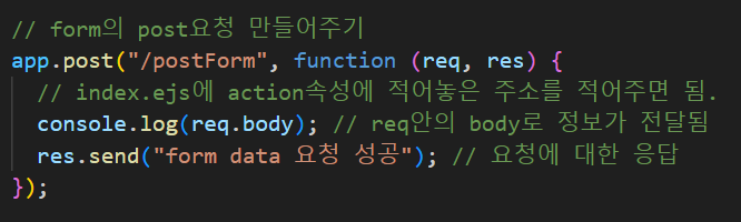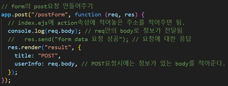 get요청과 같이 res.send를 주석처리해주고 res.render를 이용해서 title과 userInfo들을 입력하려한다. 이때 post는 body에 정보를 전달해주므로 res.body를 사용해준다.