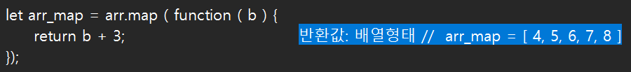 arr_map = arr.map ( ( b ) => b + 3 ) // arr_map = [4, 5, 6, 7, 8]