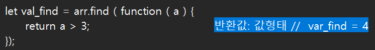 - arr.find( ): return 이후의 조건에 만족하는 요소의 첫번째 값을 찾아서 "값"으로 반환시킨다.