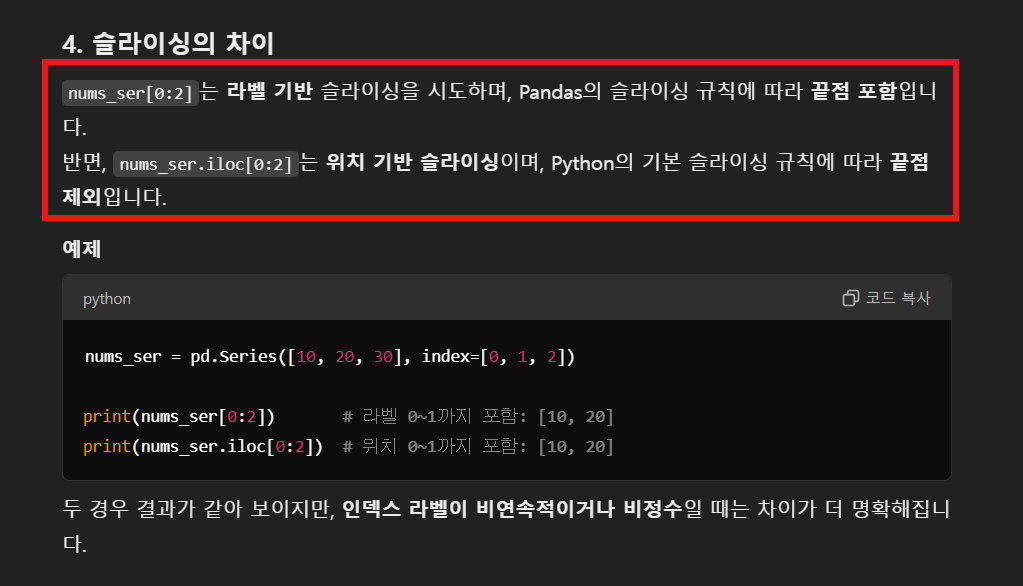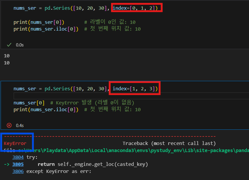 num_ser[0] / num_ser.iloc[0] / num_ser.loc[0]우선 num_ser.loc[0]는 문자열로 찾는 것이라 나머지 두가지와 성격이 조금 다르다. 나는 num_ser[0] , num_ser.iloc[0] 이 두가지를 비교해보고 싶었다. 수업 시간에 예제를 풀며 둘 다 사용해봤는데 어차피 같은 기능이라면 왜 두가지 함수가 존재할까 생각해보다 이리 저리 시도해보니 다른 점을 발견했다. 보기엔 생김새만 약간 다르고 같은 동작을 하는 것 같은데 차이점을 한 번 발견하니 쓰임새가 확실히 다르다.