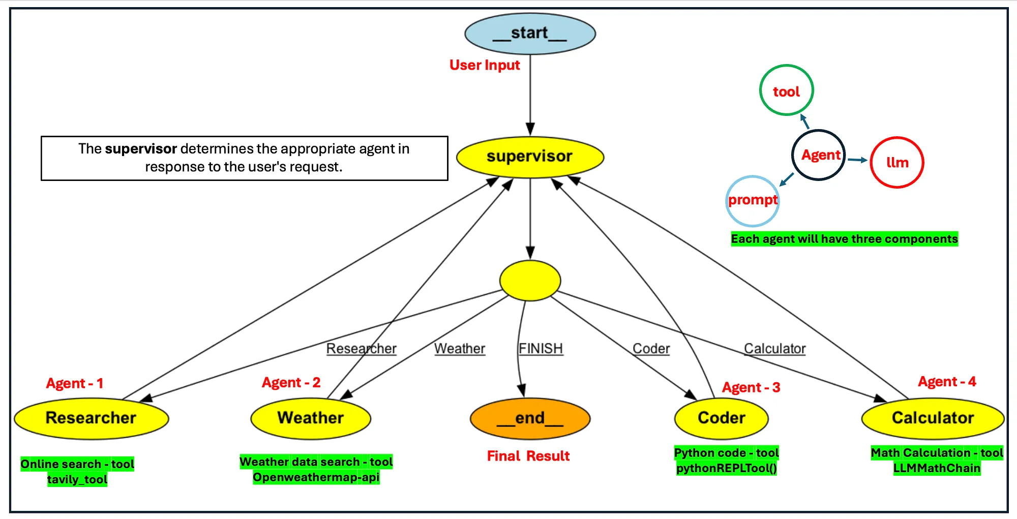 LangGraph는 단일 에이전트의 한계를 뛰어넘는 다중 에이전트 시스템을 구축할 수 있게 해줍니다. 각 에이전트는 특정 목표를 향해 자율적으로 행동하며, 다른 에이전트들과 협업하여 복잡한 문제를 해결합니다. 이러한 에이전트는 복잡한 의사결정을 위한 사전 정보, 작업 단계를 단축하기 위해 도움이 되는 미리 정의된 도구들 등에 접근하여 활용할지 스스로 결정할 수 있습니다.