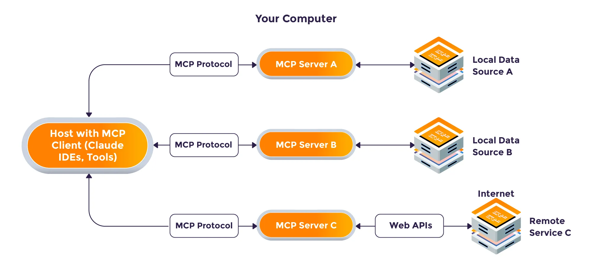 이 구조 덕분에 LLM은 외부 도구의 복잡한 API를 직접 다루는 대신, MCP라는 단일화된 통로를 통해 모든 작업을 처리할 수 있다. 한마디로 MCP는 LLM과 외부 통신을 편하게 연결시켜 주는 규율이라 볼 수 있다.