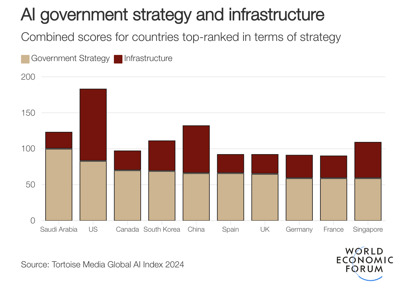 아래는 영국 토터스 미디어(Tortoise Media)에서 발표한 「The Global Artificial Intelligence Index」 의 2024년 평가 자료로 국가적 전략과 인프라라는 두개의 평가 지표를 통해 국가별 AI 역량을 간단히 비교해볼 수 있는데요,