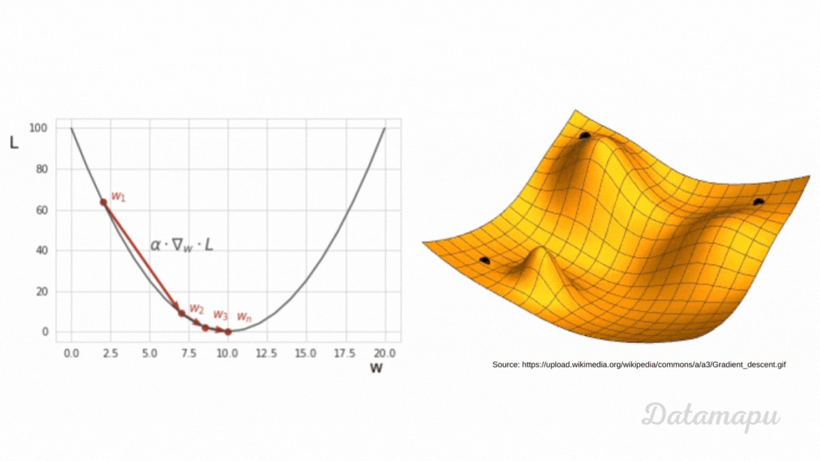 w)에 대해 손실 함수의 기울기를 구하고, 기울기의 반대 방향으로 이동하며 최적점을 찾는다.