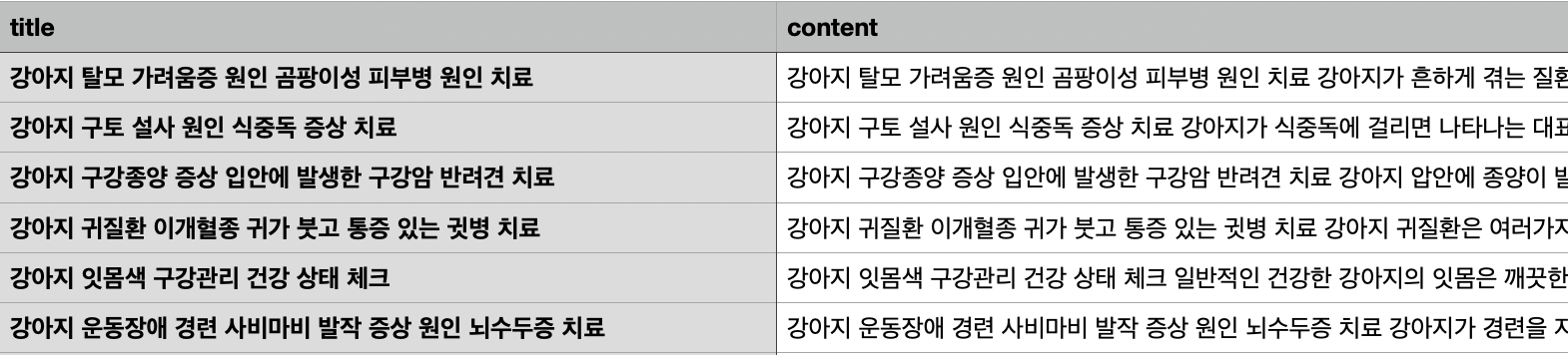 주제가 선정되고 바로 데이터 수집에 들어갔는데요, 크롤링은 지난 몇 번의 프로젝트를 통해 해봤던 작업이라 수월하게 이뤄졌는데, 문제는 저작권에 위배되지 않는 데이터를 찾는 것이었습니다. 크롤링 해온 데이터는 유튜브 자막, 반려견 관련 커뮤니티, 수의사 블로그, 수의사 커뮤니티, 강아지 사료 회사 등의 정보였는데, 전문성에는 의심의 여지가 없었으나 일부 데이터는 저작권 허가를 받지 못해 사용하지 못한 것도 있었습니다.
