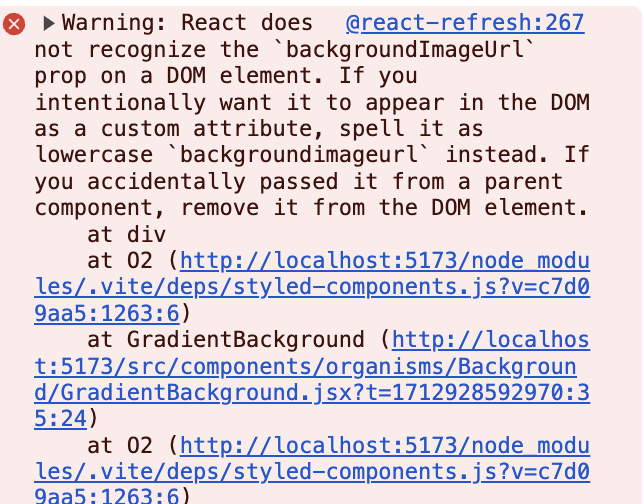 ⚠️ 리액트는 Dom 요소에 Prop된 "backgroundImageUrl"을 인식하지 못한다. 의도적으로 커스텀하여 dom에 표시하려면 소문자로 작성하고 만약 실수라면 지워라!