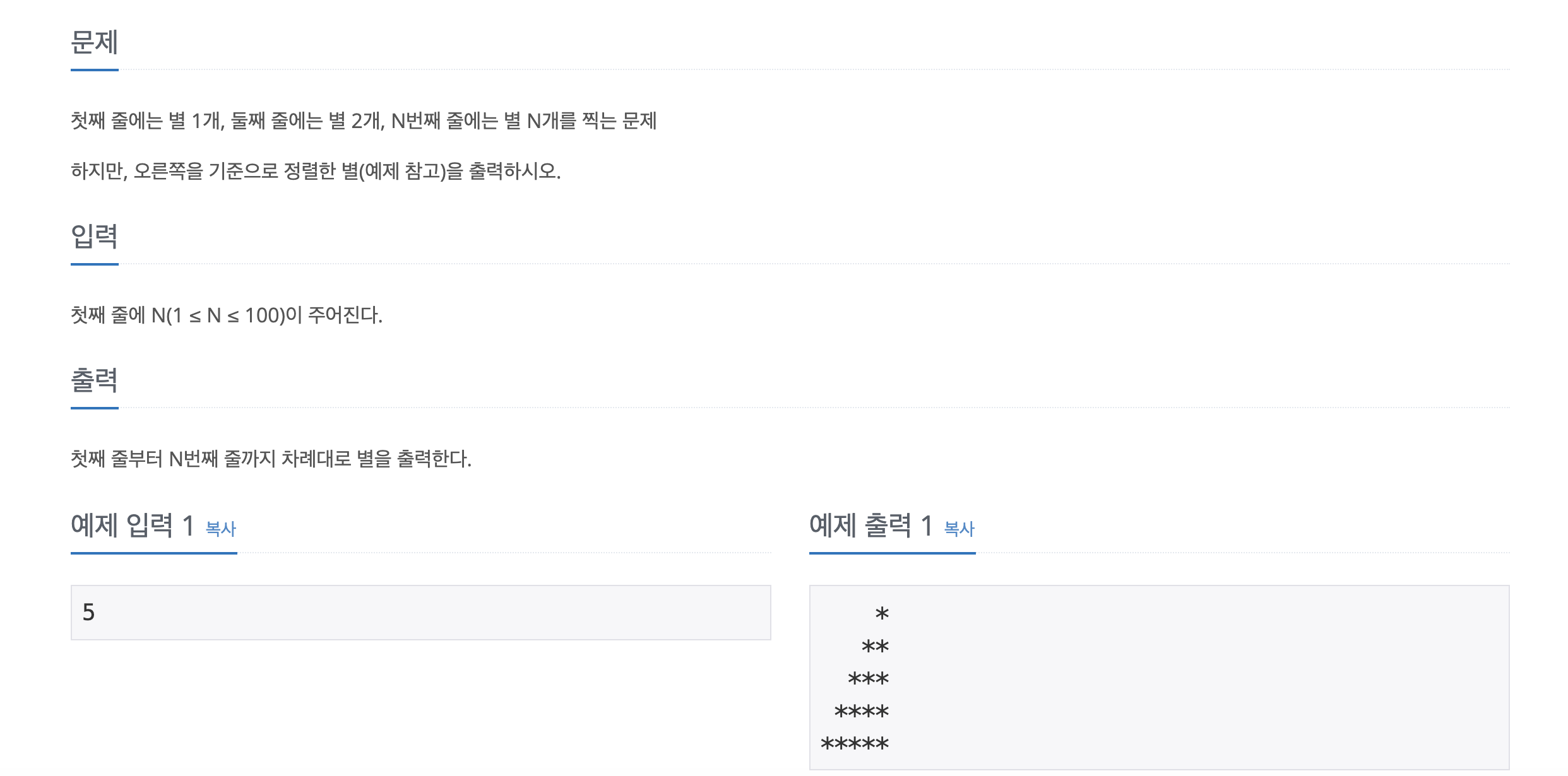 - 오른쪽 정렬이기에 공백 먼저 출력 후 별을 출력한다.