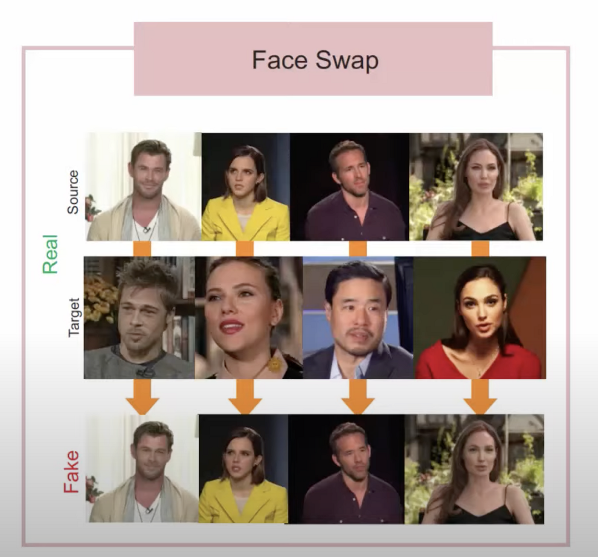 - Face Swap : 서로 다른 얼굴을 교체하는 기법, 흔히 알려진 딥페이크가 Face Swap 에 속한 것임