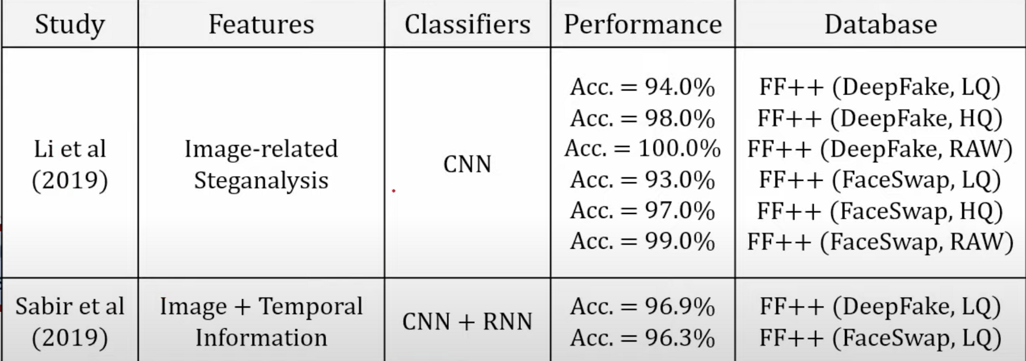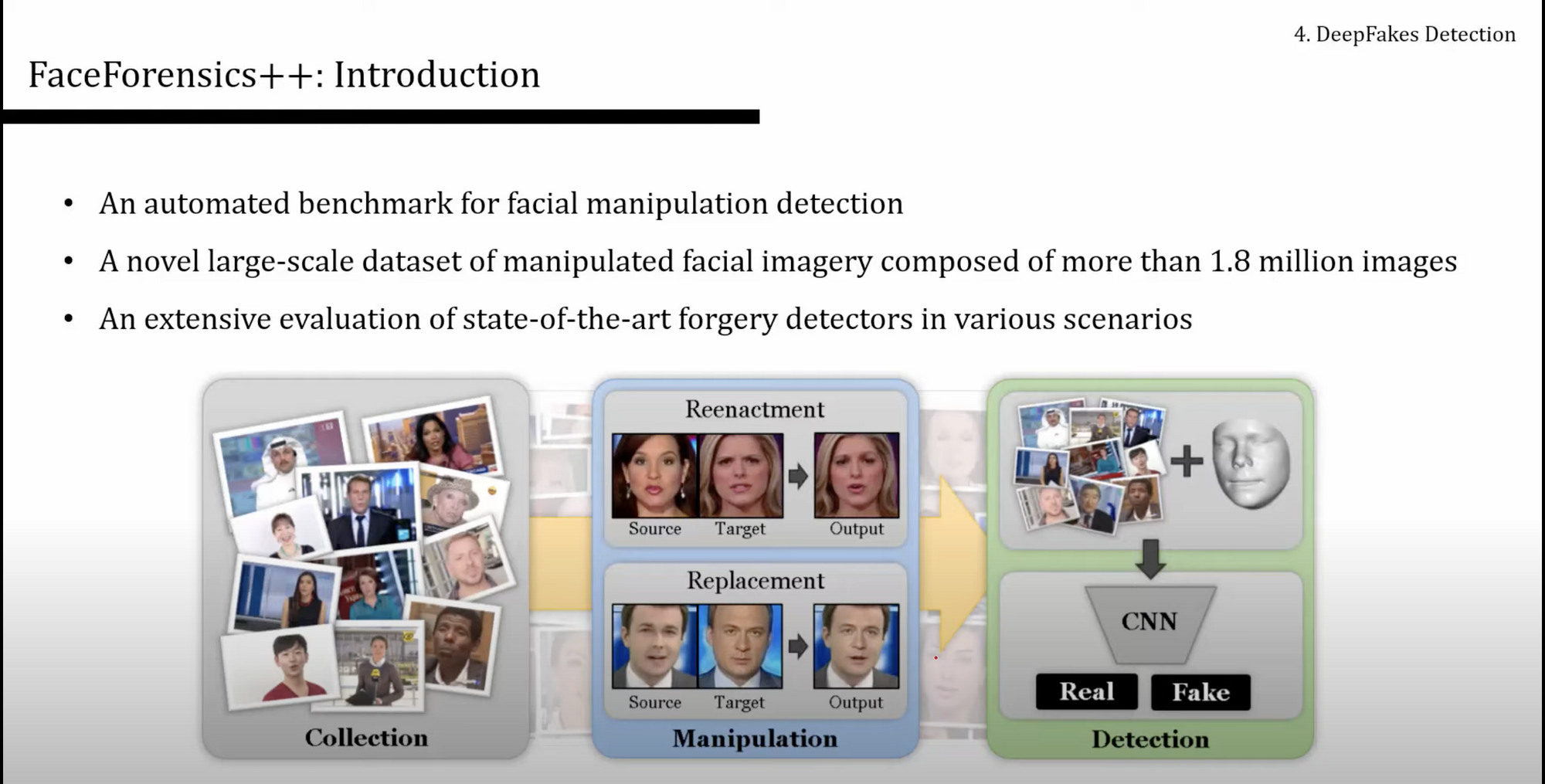 - FaceForensics++ 은 명확하고, 사용하기 좋은 논문임. 데이터셋도 제공할 뿐만 아니라 벤치마크까지 제공하는 것.