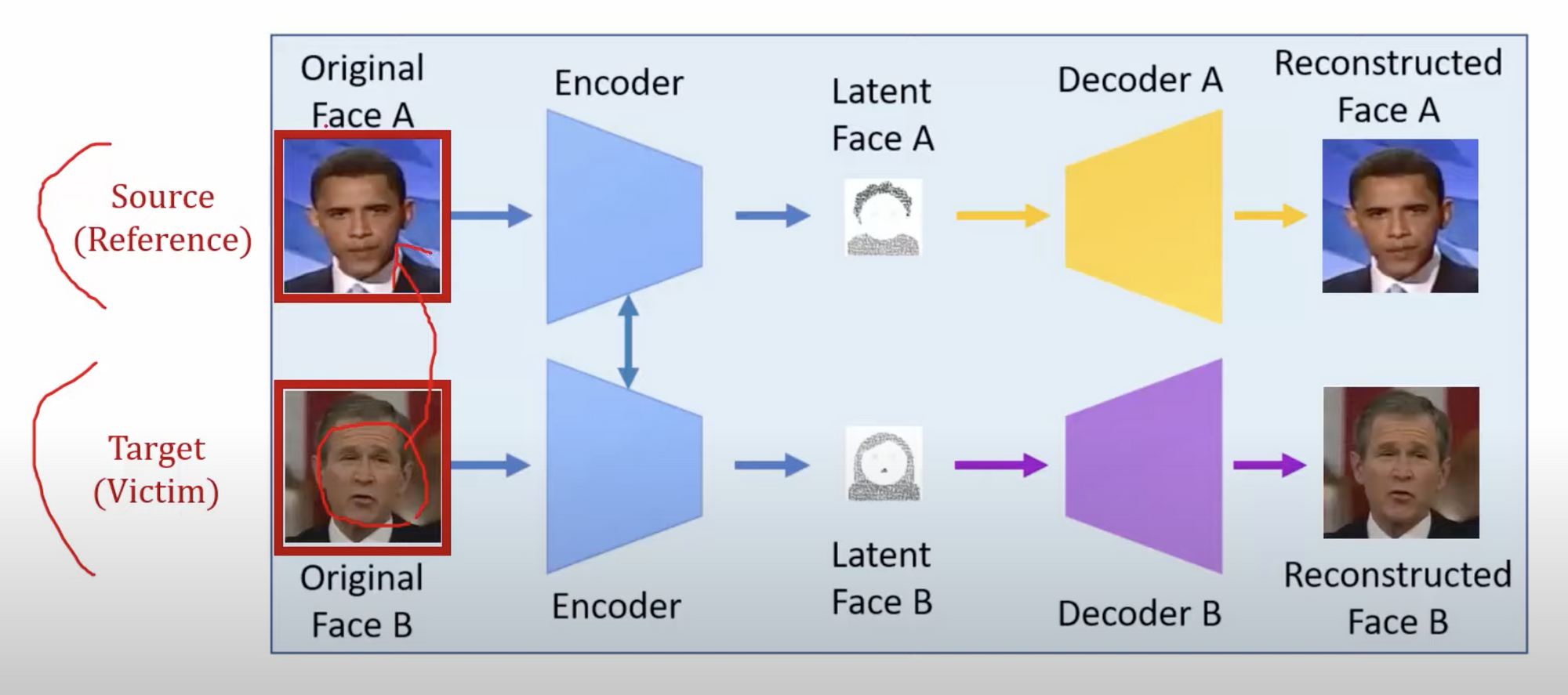 - 실제로 딥페이크가 어떤 아키텍쳐로 학습을 시켜서 피해자의 얼굴에 있는 아이덴테티를 잘 학습을 시키는지에 대해서 말할 것. 일반적으로 지금 존재하는 딥페이스 랩이나 페이스 스왑같은 라이브러리들은 tensorflow 기반으로 동작을 하고 있음. AutoEncoder 을 살짝 변형하여 사용한다는 것이 특징