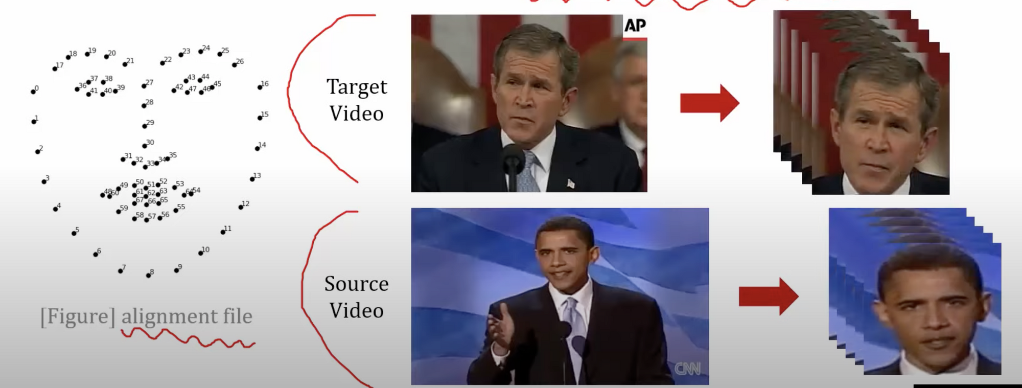 - AutoEncoder 을 이용해서 어떻게 fake video, 딥페이크 영상을 만들 수 있는 걸까요? → 이에 대해서 설명하기 위해서 실제로 딥페이크, 그 중에서도 여러 장의 이미지를 이용해서 학습을 시키는 그 대표적인 딥페이크 유형에서 실제로 딥페이크 비디오가 어떻게 만들어지는지에 대해서 설명 할 것. → 첫 번째 단계는 Extraction 임. 그냥 추출인데, 이미지에서 사람의 얼굴 부분을 추출하겠다는 것. → 여기서 말하는 Extraction 같은 경우에는 학습을 위해서 얼굴 이미지를 추출하는 것이라고 볼 수 있음 또한, optionally alignments file 이나 mask file 등을 만들 수 있음 → alignments file 같은 경우에는 흔히 68개의 랜드마크로 구성된 형태(아래 사진 왼쪽 부분)로서, 특정한 얼굴이 있을 때, 그 얼굴에서 주요 랜드마크의 위치가 어디인지를 기록해놓고 있는 파일을 의미함. 특히, OpenCV 와 같은 라이브러리를 이용하게 되면 이런 alignments 정보 또한, 잘 찾아서 랜드마크 정보 또한 파일로서 만들어주곤 함. → 첫 번재 단계인 Extraction 단계에서는 이런 역할을 수행함. → 또, 추가적으로 이런 랜드마크 파일을 이용해서 학습 과정이나 converting 과정에서 도움을 얻을 수 있음.