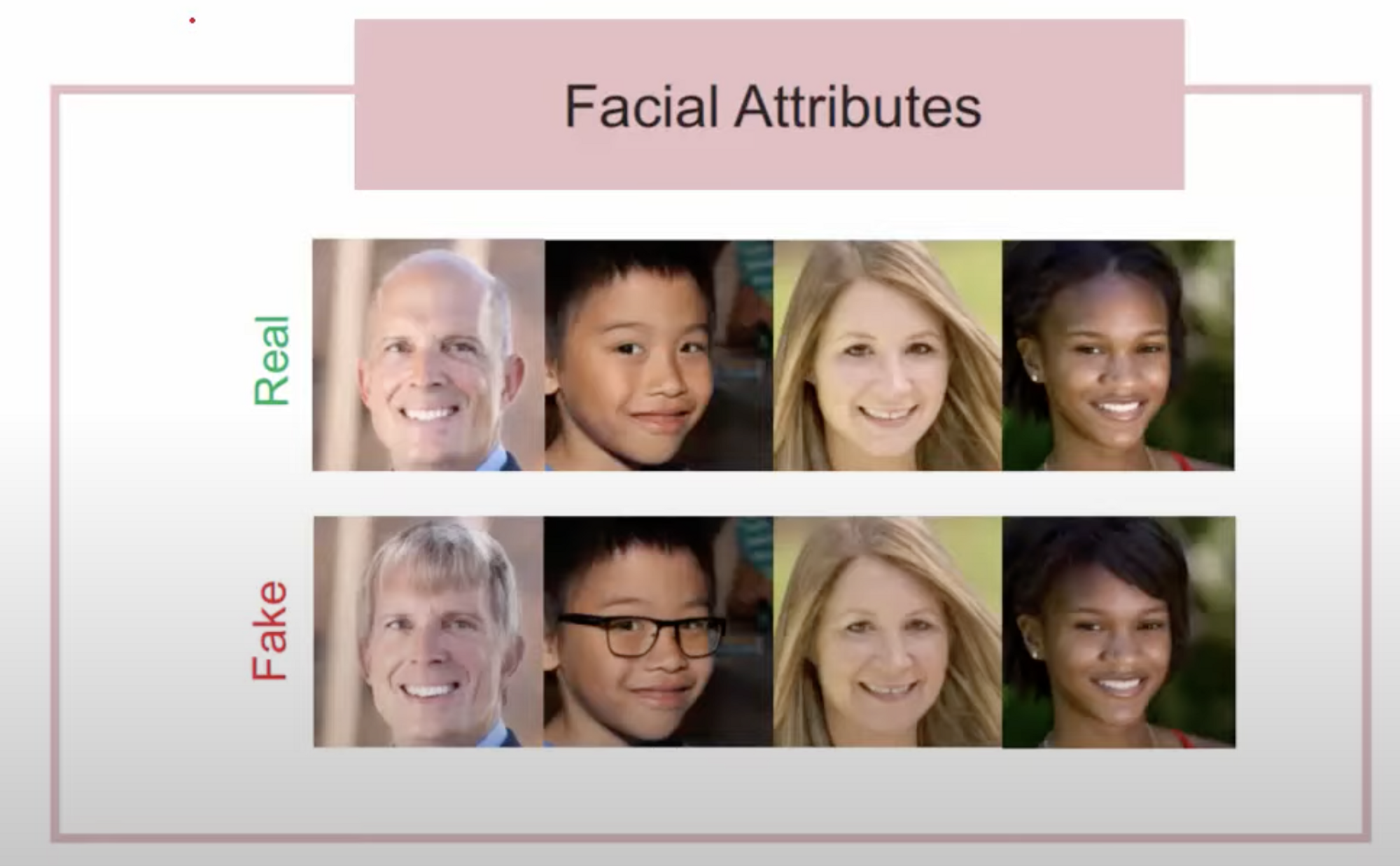 - Facial Attributes : 기존에 존재하던 얼굴에서 특정한 속성만 바꾸는 방법 ex) 안경을 쓰지 않고 있던 얼굴에 안경을 씌우거나 등