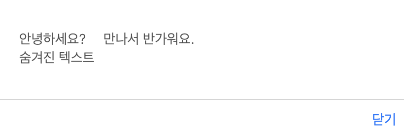 <div id='my_div'> 안녕하세요? 만나서 반가워요. <span style='display:none'>숨겨진 텍스트</span> </div> <input type='button' value='innerHTML' onclick='getInnerHTML()'/> <input type='button' value='innerText' onclick='getInnerText()'/> <input type='button' value='textContent' onclick='getTextContent()'/>function getInnerHTML() { const element = document.getElementById('my_div'); alert(element.innerHTML); } function getInnerText() { const element = document.getElementById('my_div'); alert(element.innerText); } function getTextContent() { const element = document.getElementById('my_div'); alert(element.textContent); }
