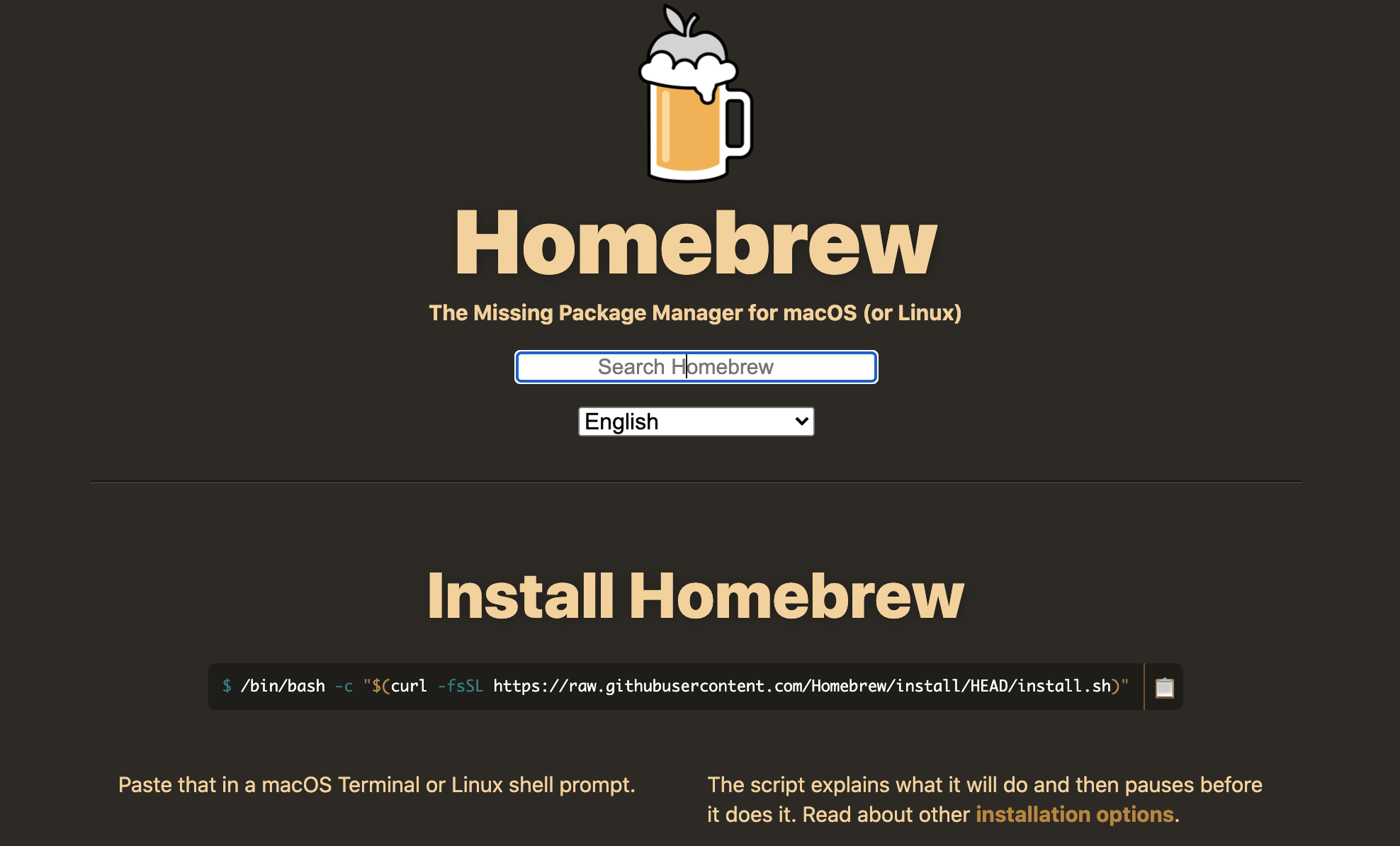https://brew.sh/ 사이트에 접속하면 아래와 같은 화면이 나옵니다.
