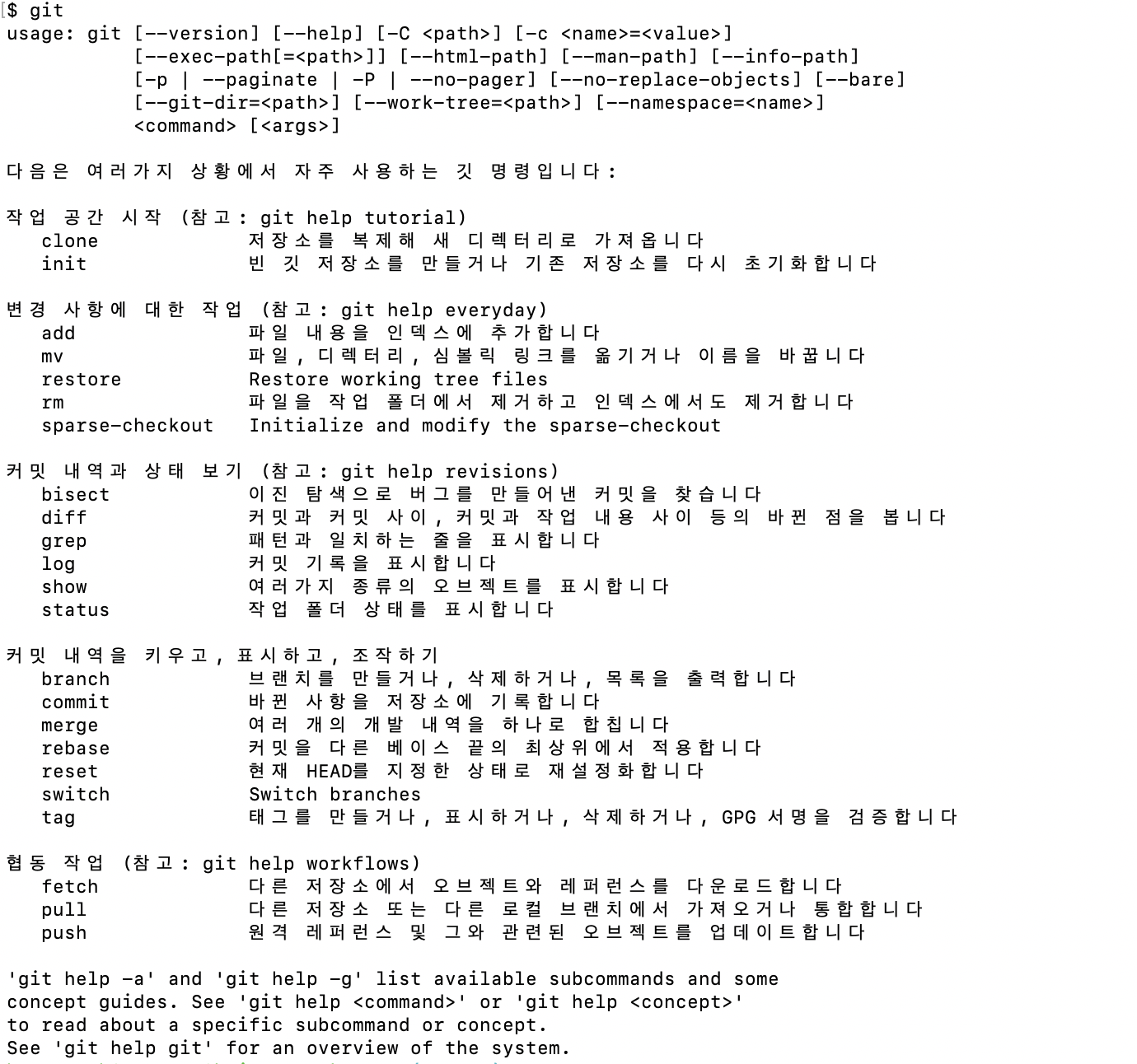 설치되었는지 확인하기 위해서는 git을 입력해주면 됩니다. git사용법이 출력되면 정상적으로 설치된 것입니다.