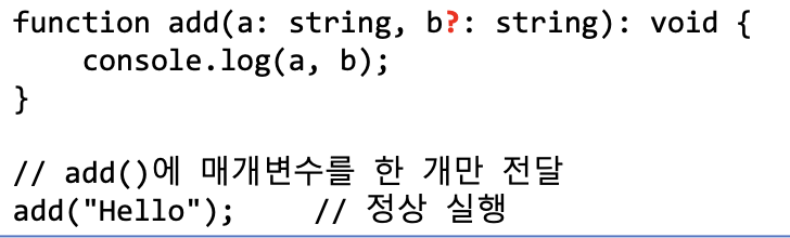 필수 매개변수가 아닌 경우 매개변수 이름 뒤에 물음표(?) 기호를 붙임