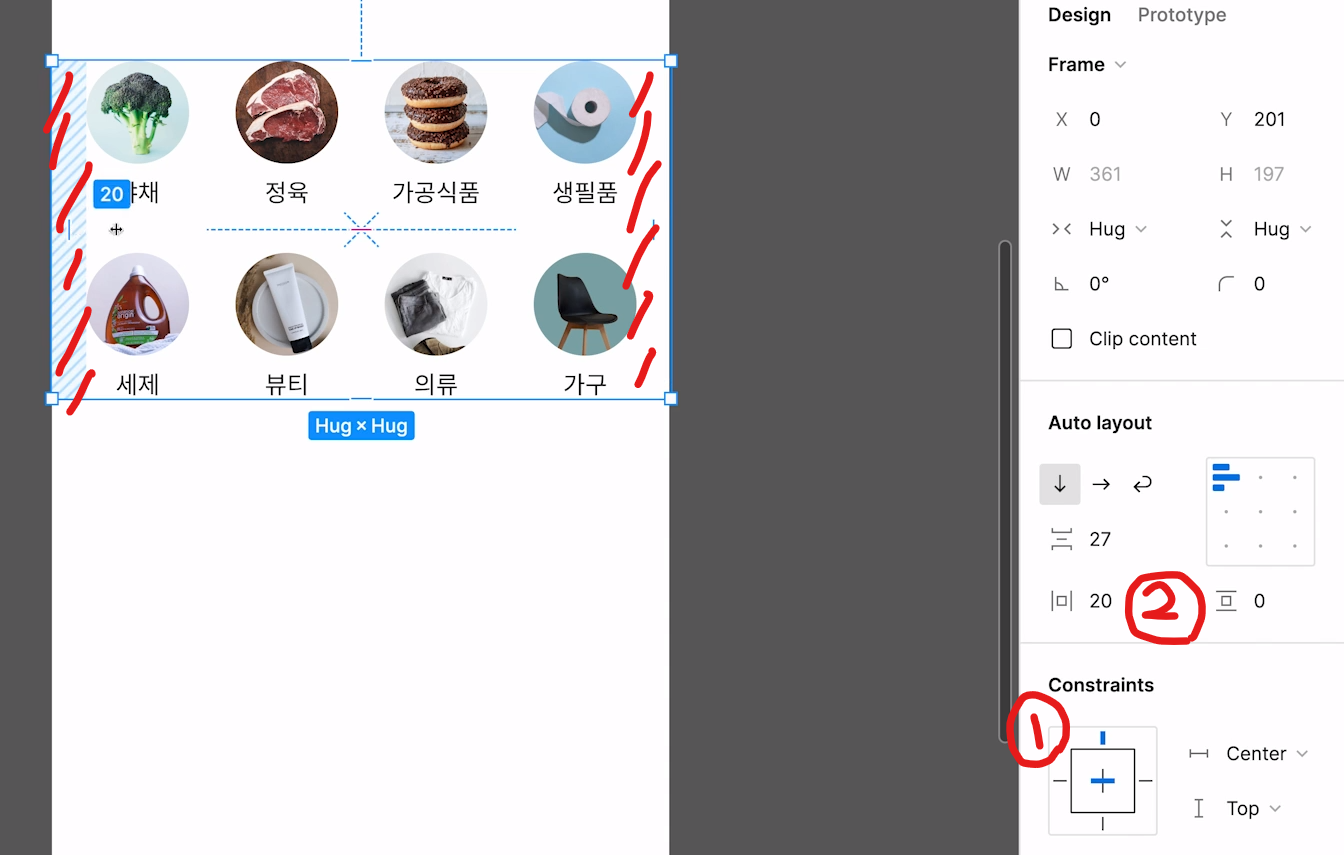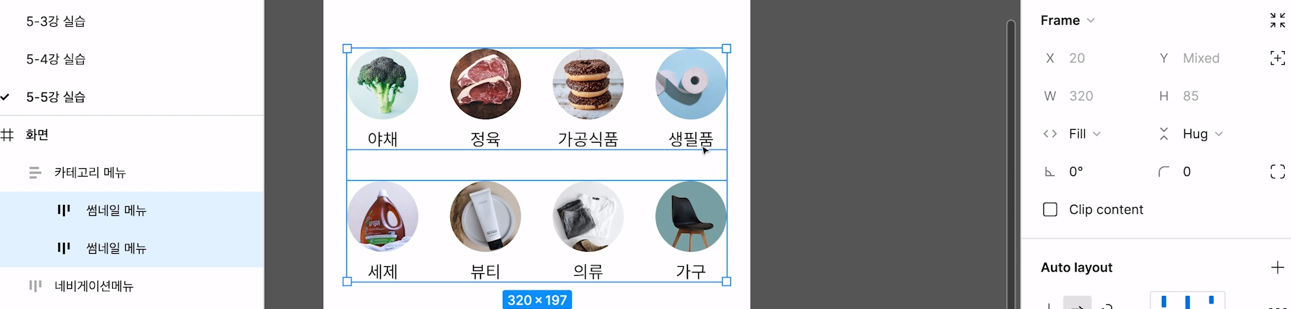 이미지가 들어갈 원과 텍스트를 오토 레이아웃을 활용해 8개의 썸네일을 만든다.