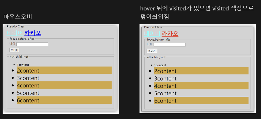 :link 방문 전 링크 :visited 방문한 링크:active active (ex. 클릭):hover 마우스 포인터 올려 놓는 행동:focus 사용자가 포커스하고 있는 요소 (탭으로 입력칸 이동할 때 보이는):nth-child 자식 목록 중 불러올 인덱스:not(selector) not(selector)안에 포함된 요소 제외대표적인 가상 클래스 사용시 LVHA