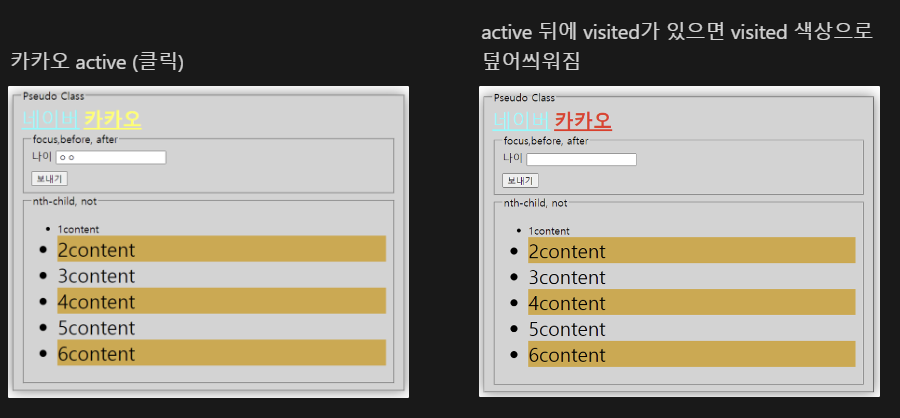 link→ 방문한 링크 속성visited→ 마우스 오버 시 속성hover→ 클릭 등 active 시 속성active