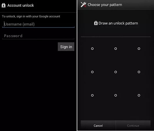 안드로이드 4.4 이하에서 실행되는 삼성 갤럭시을 사용 중 패턴 비밀번호를 잃어버린 경우 이 방법으로도 문제 해결이 가능합니다. 잘못된 핀 또는 패턴을 5회 이상 입력하고 "패턴을 잊어버렸습니다."를 선택합니다. 이는 여러분이 Google 계정과 비밀번호를 입력하게 해 삼성에서 패턴 잠금을 제거하도록 설정되어 있습니다.
