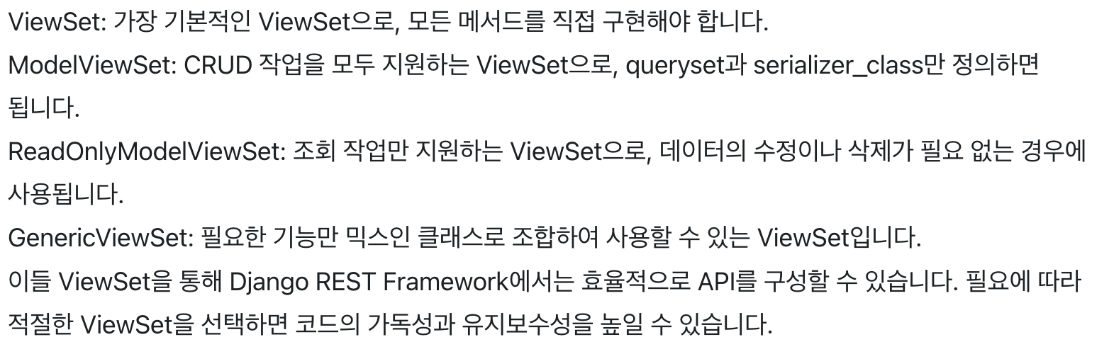 이들 ViewSet을 통해 Django REST Framework에서는 효율적으로 API를 구성할 수 있습니다. 필요에 따라 적절한 ViewSet을 선택하면 코드의 가독성과 유지보수성을 높일 수 있습니다.