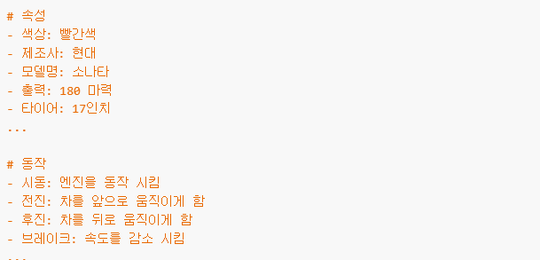 -> 빨간색 소나타 뿐 아니라 파란색 소나타도 있고, 검은색 제네시스도 있고 등등 공통적인 성질을 가지고 있지만 구체적인 값들이 다른 여러 객체가 있을 수 있다 따라서 공통적인 속성 , 동작을 가지는 상위 개념을 정의할 수 있는데 그것이 바로 클래스이다.