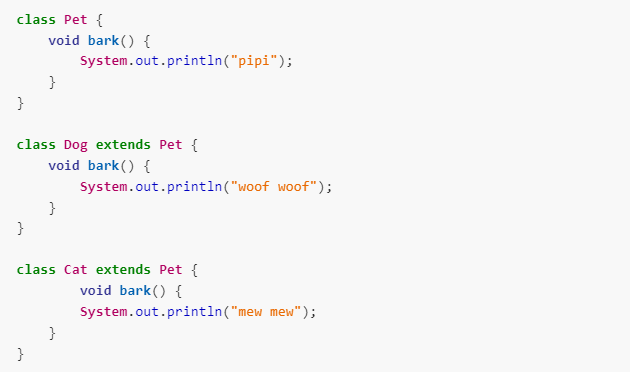 ex) 애완동물 클래스가 있고, bark() 라는 메서드가 있다고 할 때 애완동물 클래스를 상속 받는 강아지와 고양이 클래스를 만들 경우 bark()메서드의 오버라이딩을 통해 서로 다른 동작이 가능하게 할 수 있다.