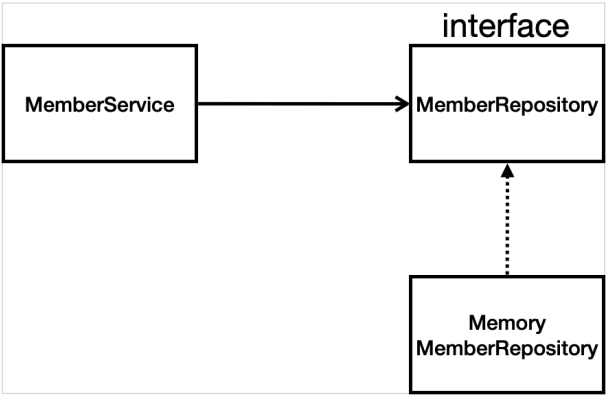 아직 데이터 저장소가 선정되지 않았기 때문에 , 인터페이스로 우선 구현 클래스를 변경할 수 있도록 설계
