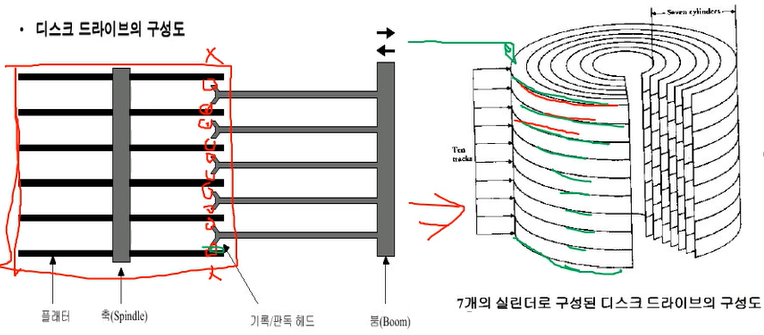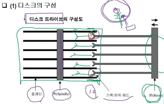 축(Spindle)은 원판의 기준이라고 생각한다.플래터는 원판 이라고 생각한다.기록/판독 헤드는 원판에 올려놓는 바늘과 같음붐은 원판에 바늘을 위치시키기 위해 움직이는 부분 -> 첫번째 판의 위쪽과 마지막판의 아래쪽 부분은 읽지 않는다