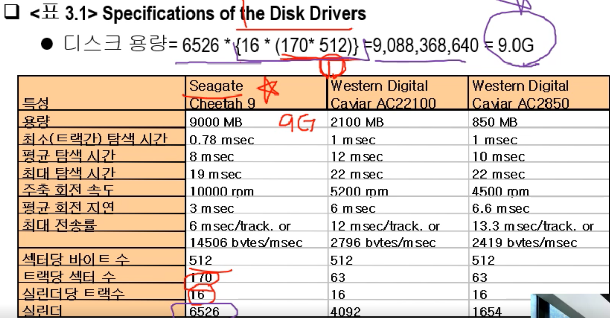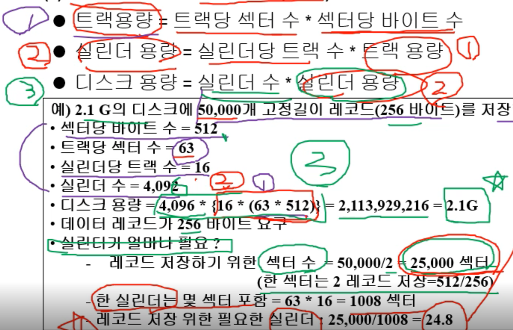 ex) 위 그림에서 트랙 용량 , 실린더 용량 , 디스크 용량 ?