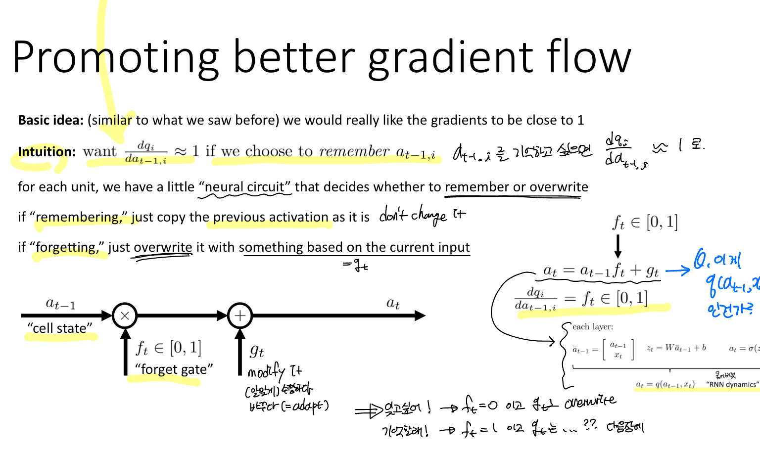 Idea: 이전 레이어의 정보(활성화 값)을 얼마나 기억할 것인가를 결정하는 "forget gate". 그리고 얼마나 잊어버릴 것인지 = 얼마나 덮어쓸 것인지를 결정하는 "overwrite gate"