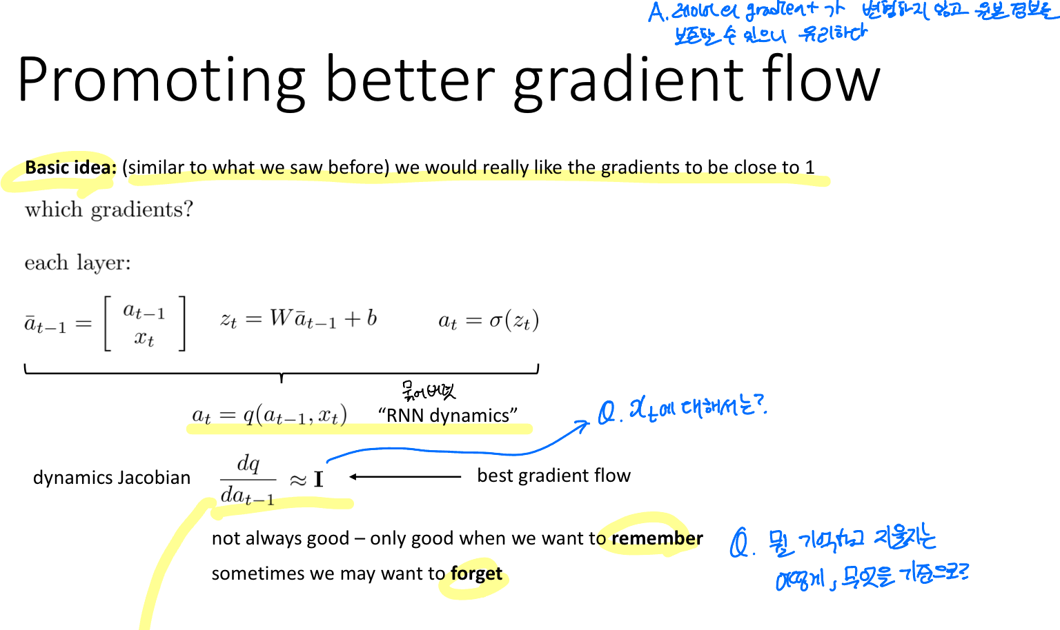 이를 위해 각 레이어의 (입력 - linear layer - activation)을 하나로 묶어 "RNN dynamics"로 둔다. 따라서 이것에 대한 자코비안 행렬이 identity matrix가 되면 gradient vanshing 문제를 해결할 수 있을 것이다.