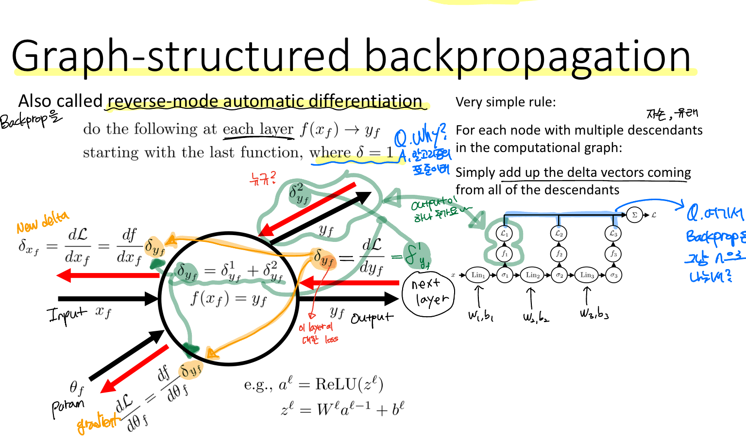 그리고 multiple descendants로부터 받은 gradient의 합산이 다음 레이어의 Upsteam derivative가 된다. 이로부터 입력과 파라미터에 대한 gradient를 구할 수 있다.