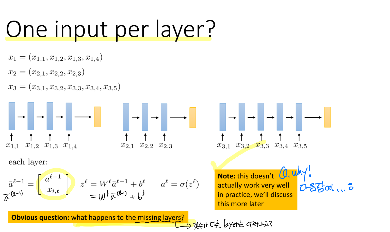 다양한 사이즈의 입력 데이터를 다루기 위해 각 레이어에 각 입력 데이터를 주어지면 어떨까 하는 아이디어이다. 시퀀스 데이터의 특성 상 이전 데이터의 정보가 다음 데이터에 영향을 미치기 때문에 입력 데이터는 (이전 레이어의 출력, 현재 레이어의 입력)이 된다.