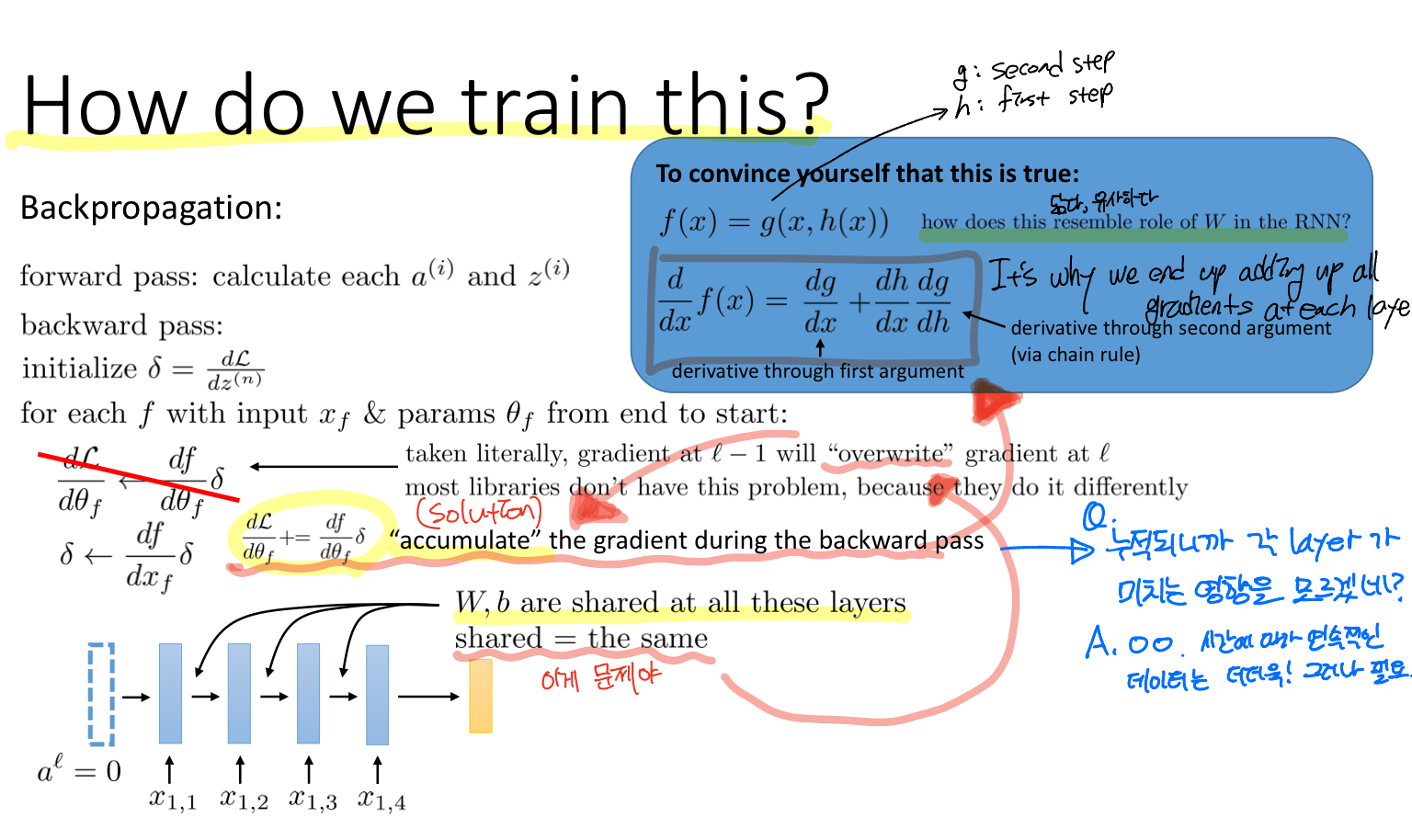 기존의 역전파 학습은 Upstream derivative(상위 레이어의 미분, 즉 gradient)을 반복적으로 업데이트하는 방식인데, RNN 구조는 각 레이어에 하나의 입력 데이터가 주어지며 모든 레이어는 가중치 행렬과 bias를 공유한다. 따라서 이전 레이어의 gradient가 다음 레이어를 "overwrite"하게 된다.
