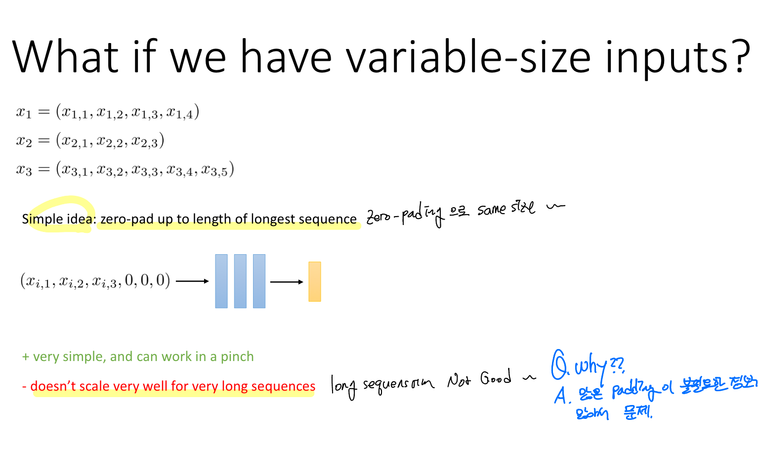 가장 단순한 아이디어로는 zero-pad를 이용해서 모든 데이터의 사이즈를 맞추는 것이다. 이때 시퀀스가 가장 긴 데이터를 기준으로 해서 맞춘다. 가장 단순하고 동작이 가능하지만 문제가 있다.