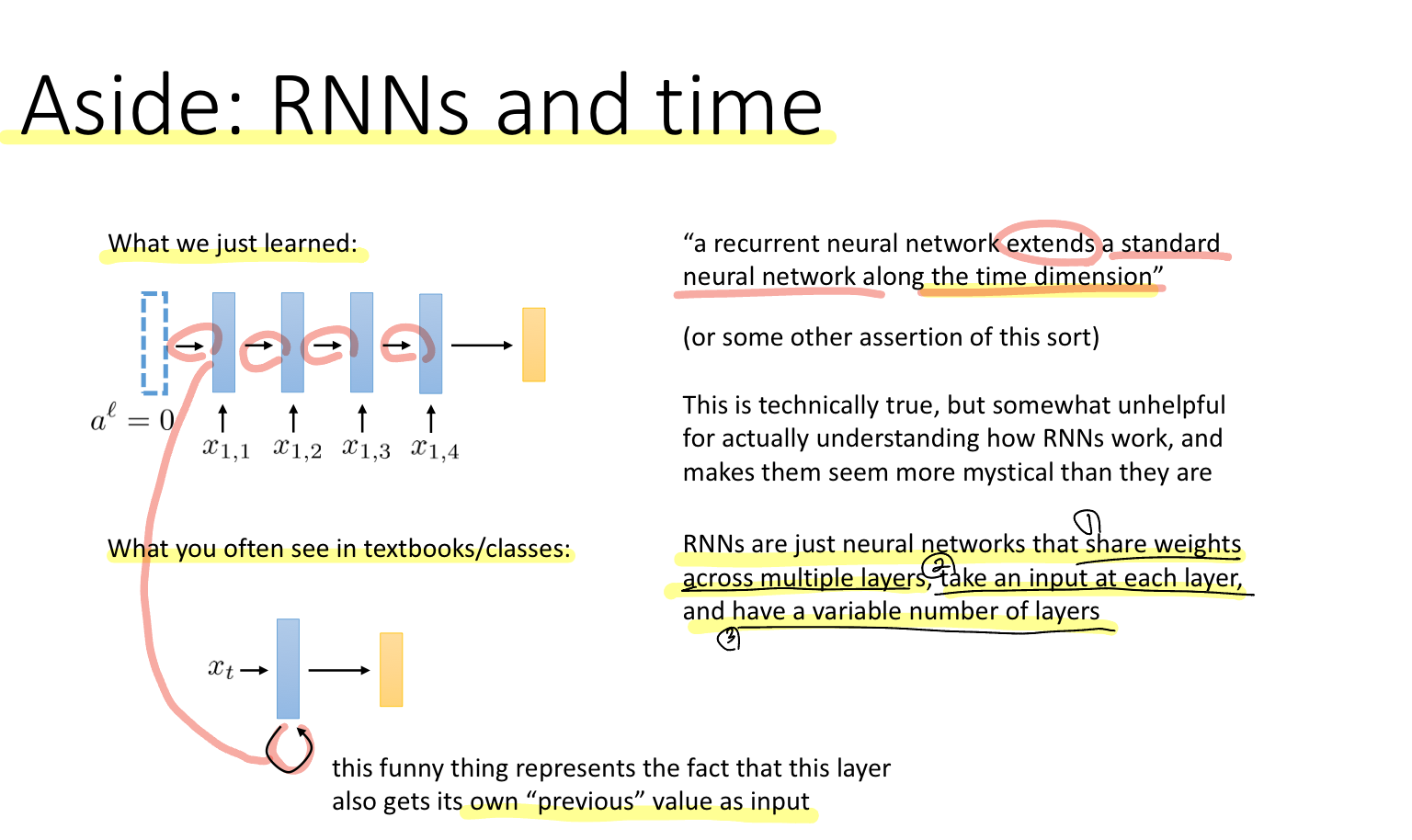 RNN은 1) 각 레이어마다 입력과 출력을 갖는 네트워크이며 2) 모든 레이어에 대해서 가중치를 공유