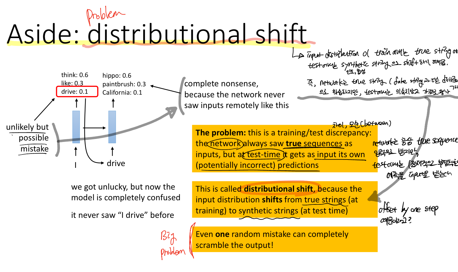 이 문제는 모델이 데이터의 실제 시퀀스에 대해 학습하는데, 테스트 데이터는 학습한 적이 없는 데이터이기 때문에 부정확한 예측을 한다는 것입니다. 또한, 이전 페이지에서 말했듯이 연속적인 데이터 사이의 조건부 확률이기 때문에 한번의 실수가 연쇄적인 오류를 발생시킨다는 문제가 발생한다는 것입니다.