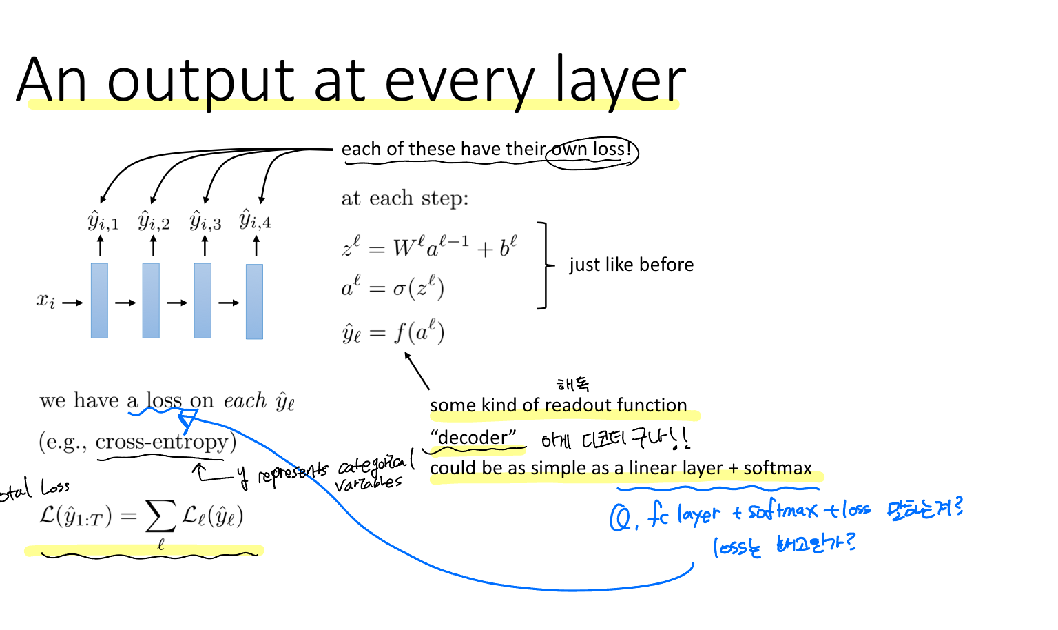 처음에는 입력 데이터의 사이즈가 다양한 경우, 그리고 출력 사이즈가 다양한 경우에 대해서 알아보았다. 매 스텝마다, 즉 각 레이어마다 입력과 출력이 있는 경우를 다뤄보면 위와 같다. 이때 입력 데이터는 이전 레이어의 출력과 현재 레이어의 입력으로 구성되어 있고, 출력은 각 레이어마다 하나의 출력이 존재하며 각각의 Loss가 존재한다.