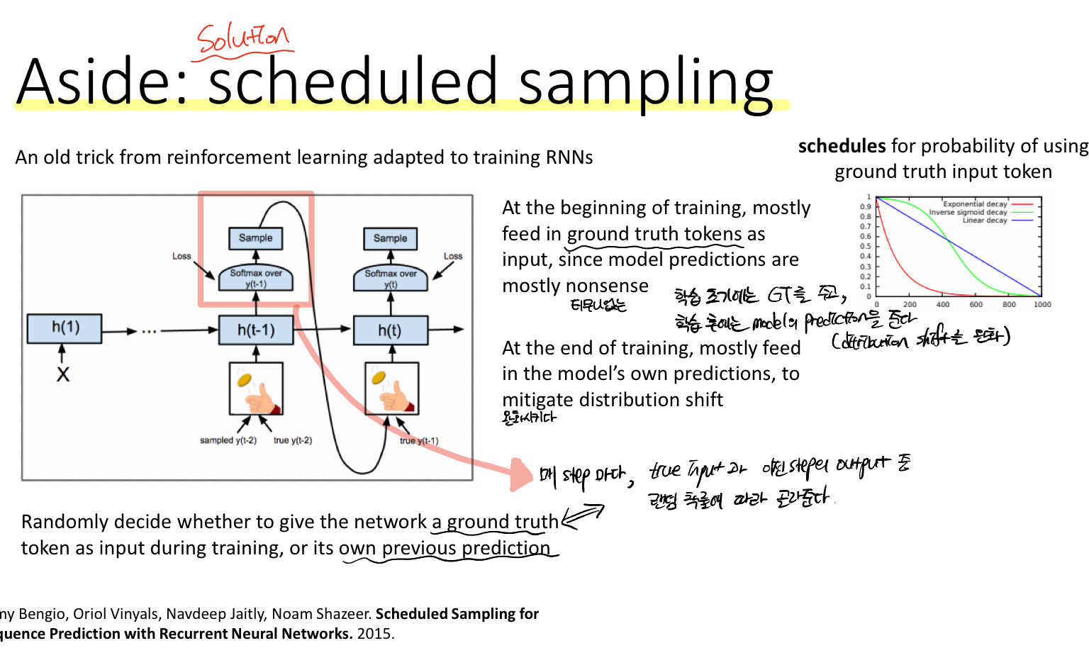 훈련 중에는 네트워크에 때로는 실측 데이터(시퀀스의 실제 다음 토큰)을 입력으로 주어주는 것을 말한다. 학습 후에는 점차 모델의 prediction을 주어줌으로써 distribution shift 문제를 완화하는 효과를 보여준다.