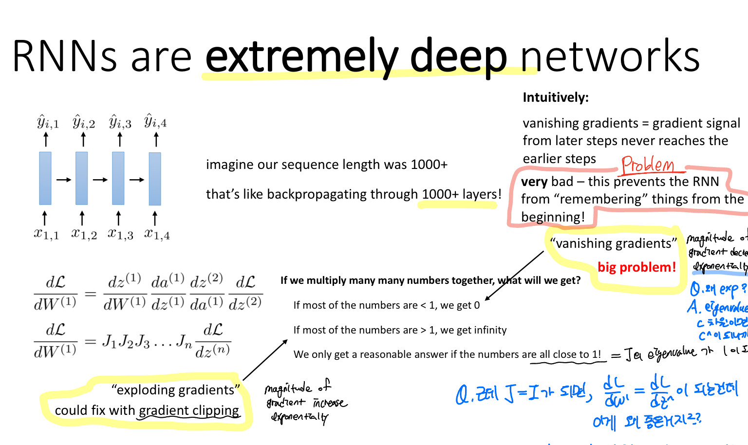 교수님은 vanishing gradient의 경우는 큰 문제를 야기하지만, exploding gradient는 gradient clipping으로 어느정도 해결이 된다고 한다.