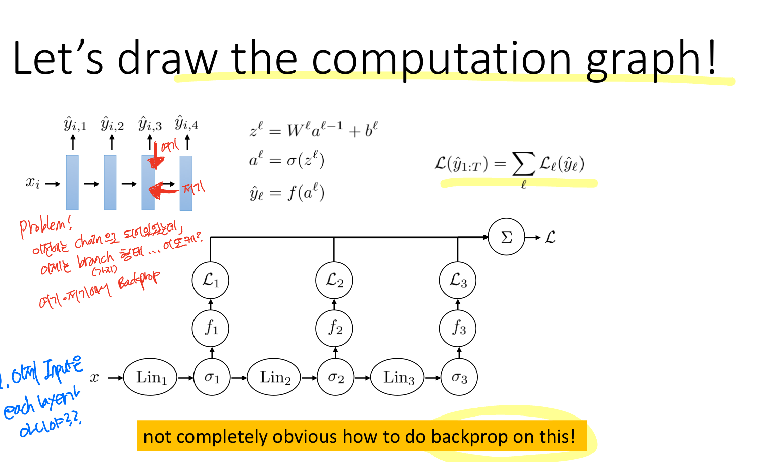 이 구조를 computation graph로 나타내면 위와 같다. 보면 알 수 있듯이 이전과 달리 backprop를 수행하는 게 쉽지 않아 보인다.